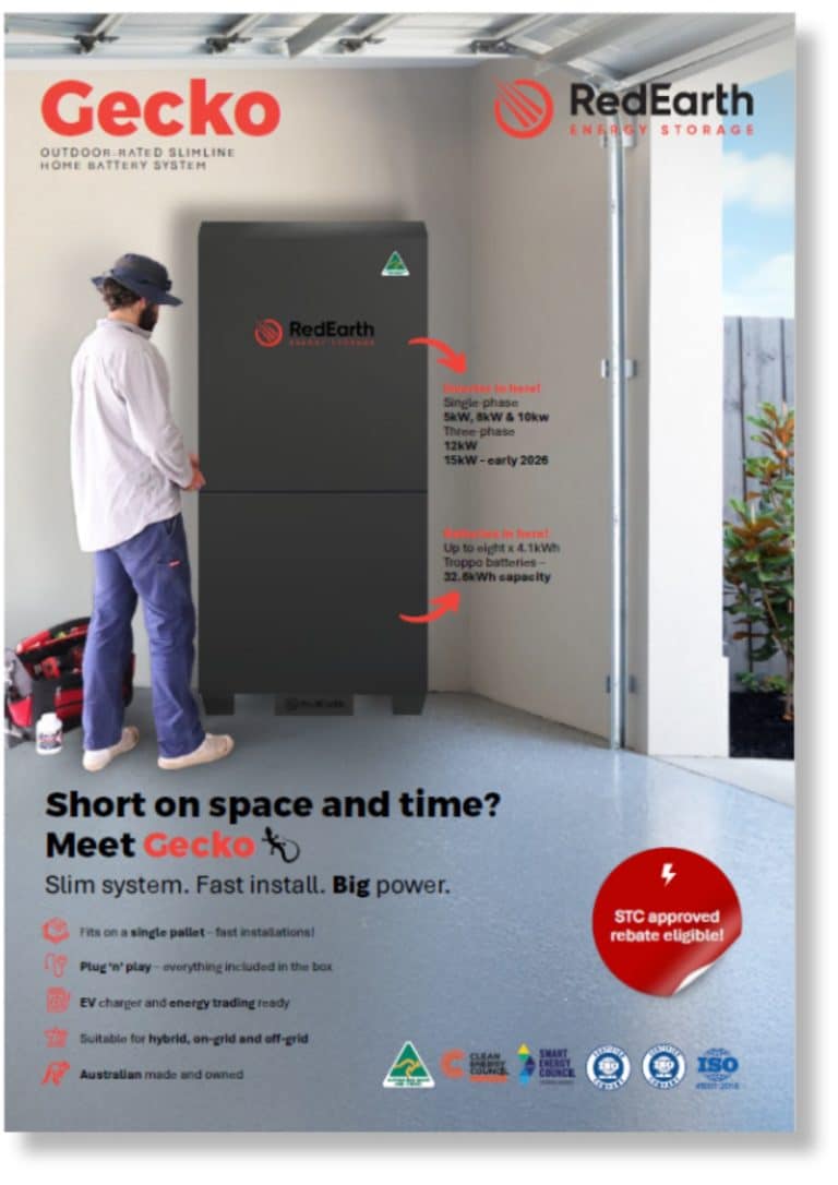 All work on a RedEarth system must be carried out by an appropriately licensed and certified electrician. RedEarth is not liable for unauthorised repairs, modifications, or works completed without approval.